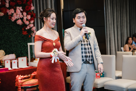 Our emcee, Ms. Carolyn Batay, which would also be one of our emcee-to-be in our upcoming wedding, entertained the guests with her angelic voice. We love Carol! She was recommended by our Ms. Monina, our wedding coordinator. Upon our first meeting, she was really kind, approachable, flexible, professional and had excellent grasp of both Chinese and English. Unlike other famous top tier Chinese emcees who also basically offer the same services, she's affordable! One big plus that got us hooked, was that she offered to emcee our Tinghun, for FREE, as long as we book her for our wedding of course. She's super friendly! Highly recommended. So, it was a no brainer to book her. Tinghuns technically does not require any emcee at all, but to make the event lively and to involve the guests in the ceremony, we opted to have one, and she's perfect for it.
